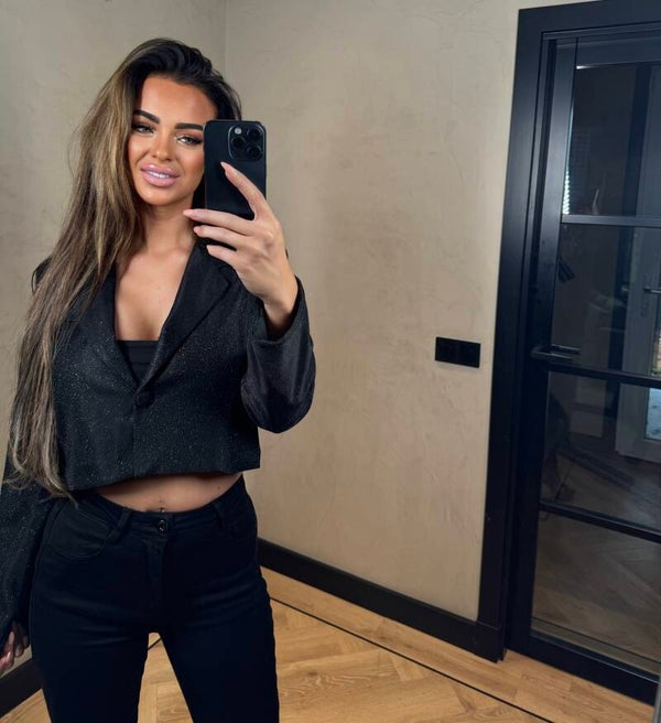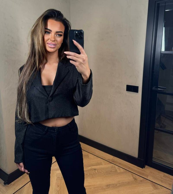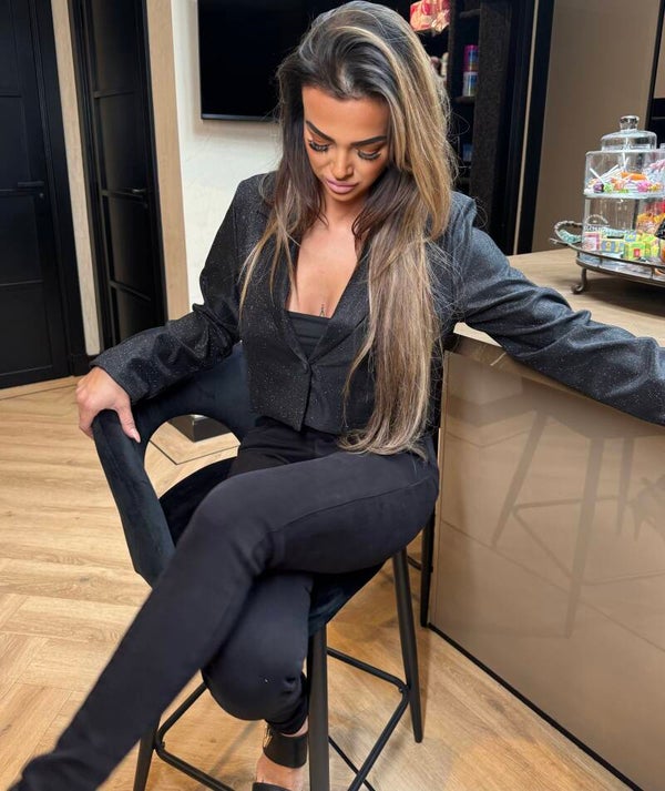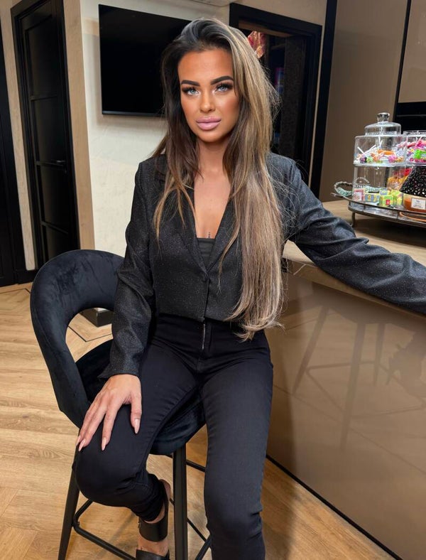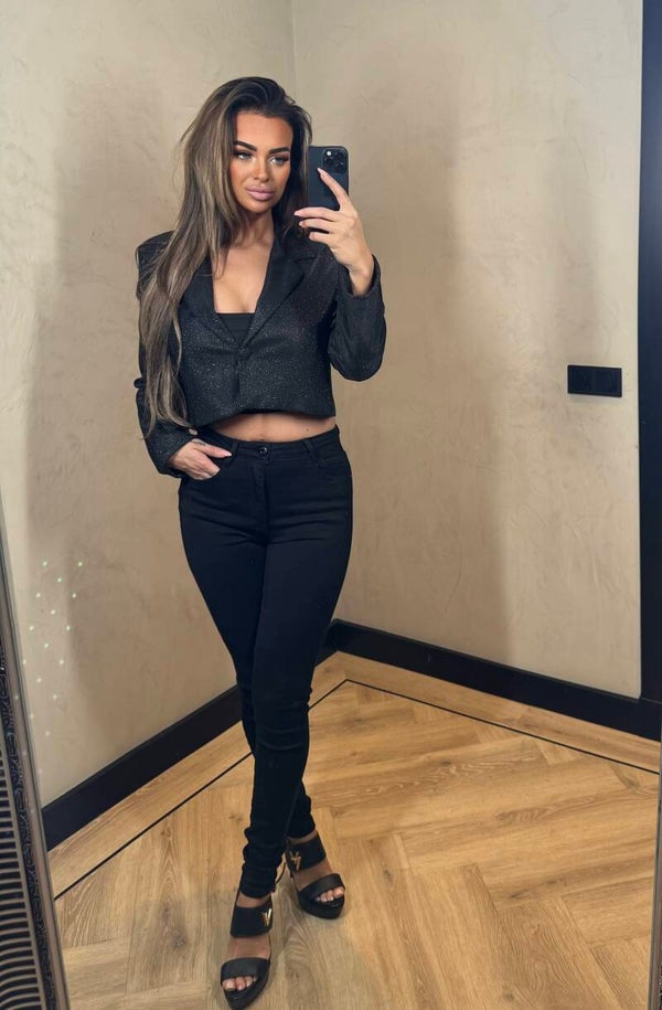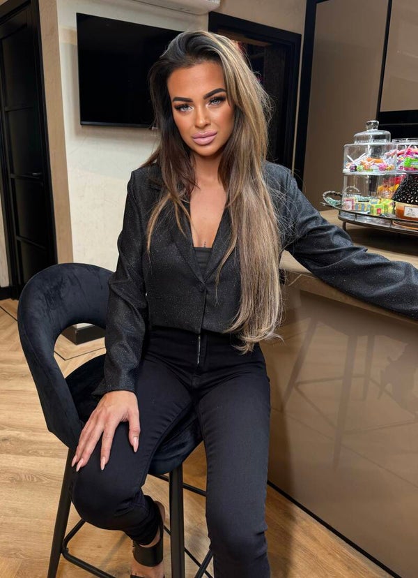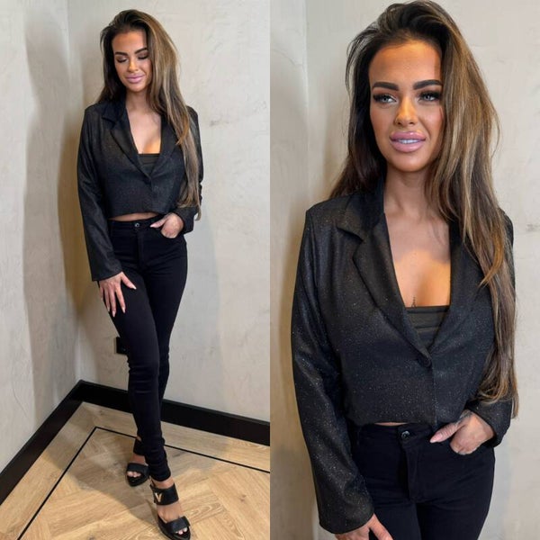 De blazer heeft overal glitters en lange mouwen, een kraag. De colbert is een korter model!