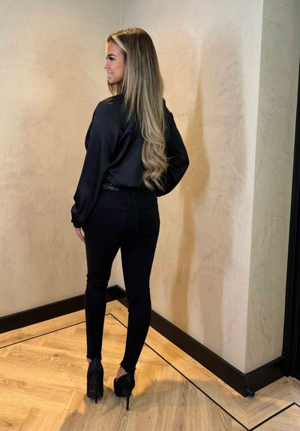 Strik blouse Deze blouse is gedetailleerd met lange mouwen en bij de kraag twee losse touwtjes om te strikken.