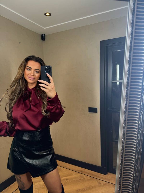 Strik blouse Deze blouse is gedetailleerd met lange mouwen en bij de kraag twee losse touwtjes om te strikken.