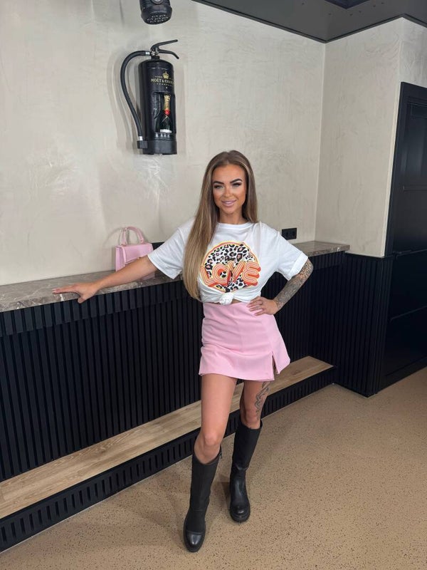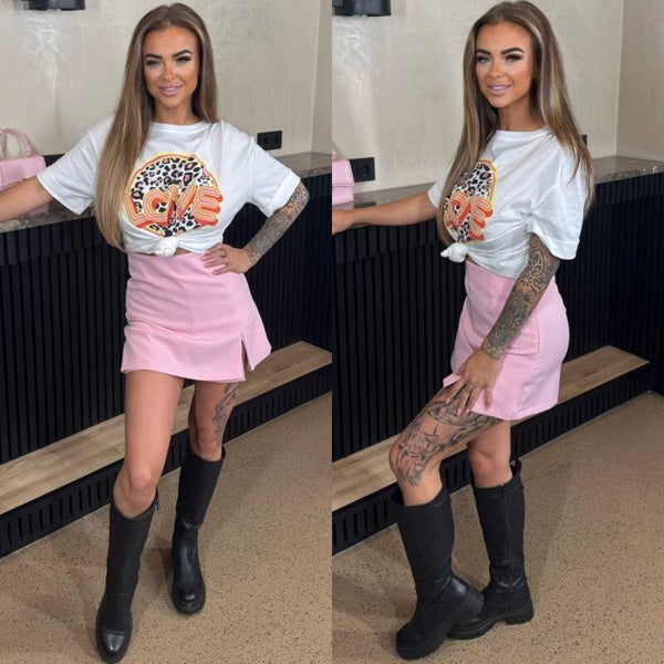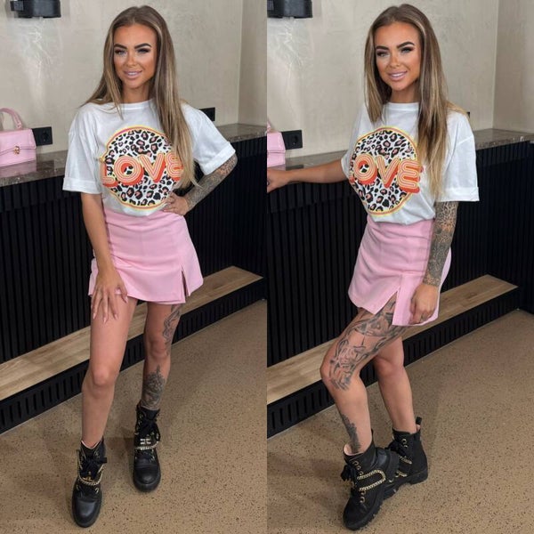 De skort heeft korte pijpen en een splitje aan de voorzijde.
