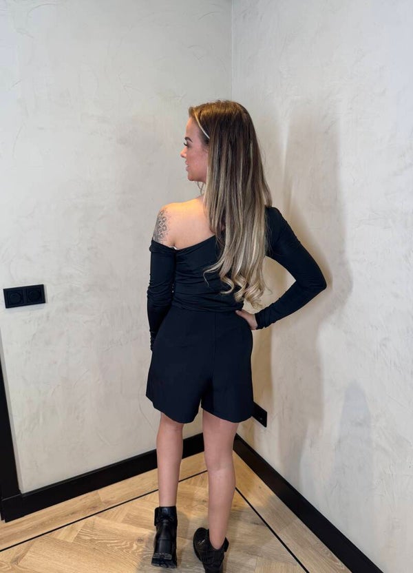 De skort heeft korte pijpen en een splitje aan de voorzijde.
