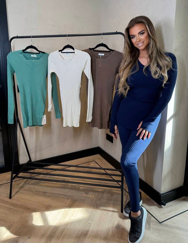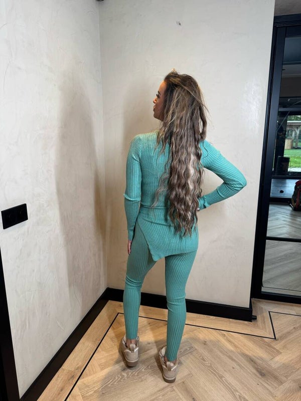 De trui heeft een v-hals en de legging een elastieke tailleband en er zit lekker veel stretch in het pak