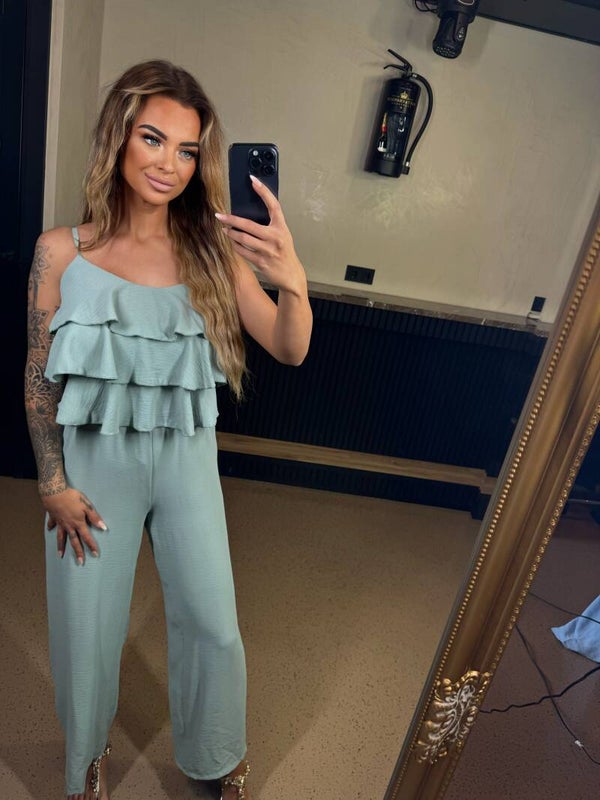 Het jumpsuit is een dun stofje. Gedetailleerd in ruffle bovenzijde en uitloopend wijder model bij de broek. De jumpsuit is hoogwater, want dat is nu de mode.