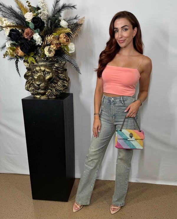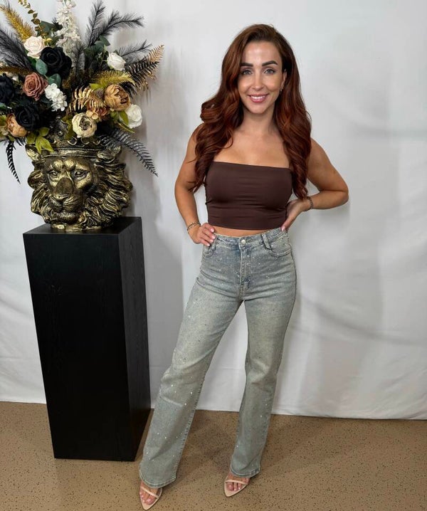 De jeans is een hoog model. De broek is gedetailleerd met all-over diamond steentjes.