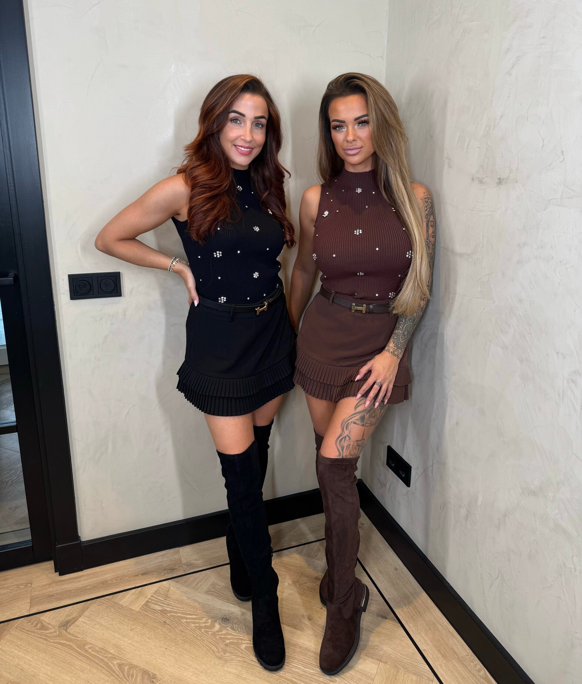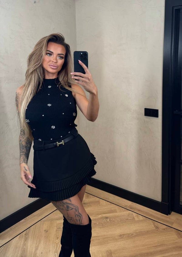 Het topje loopt mooi uit na de hals. Het topje bevat veel stretch en is gedetailleerd met. steentjes.