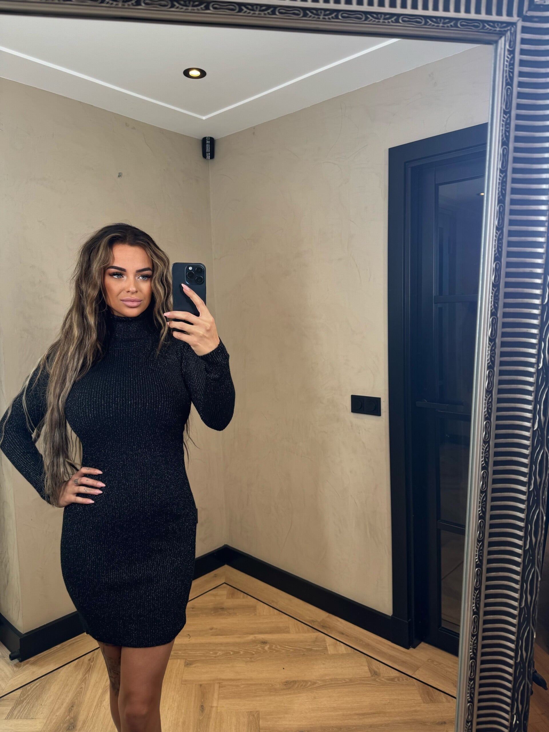 Het jurkje valt getailleerd en is gedetailleerd met een glittertje.