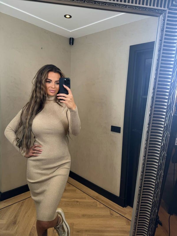Het jurkje valt getailleerd en is gedetailleerd met een glittertje.