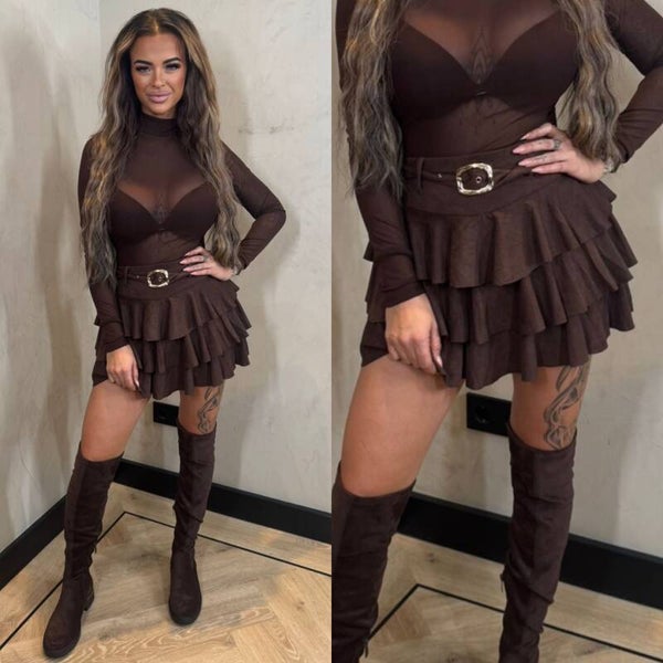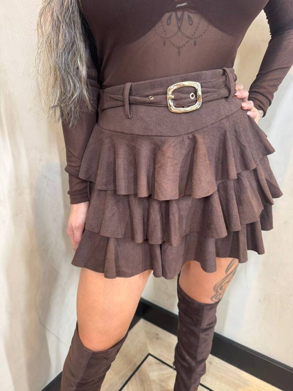 Het rok broekje heeft een plooi/roezel all over en is gedetailleerd met een bijpassende riem die vast zit. Er zit een stretchband in de het broekje/rokje.