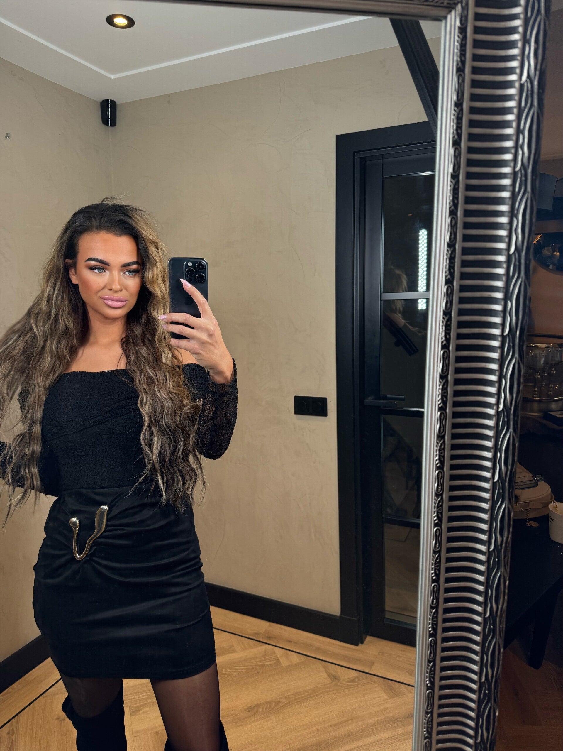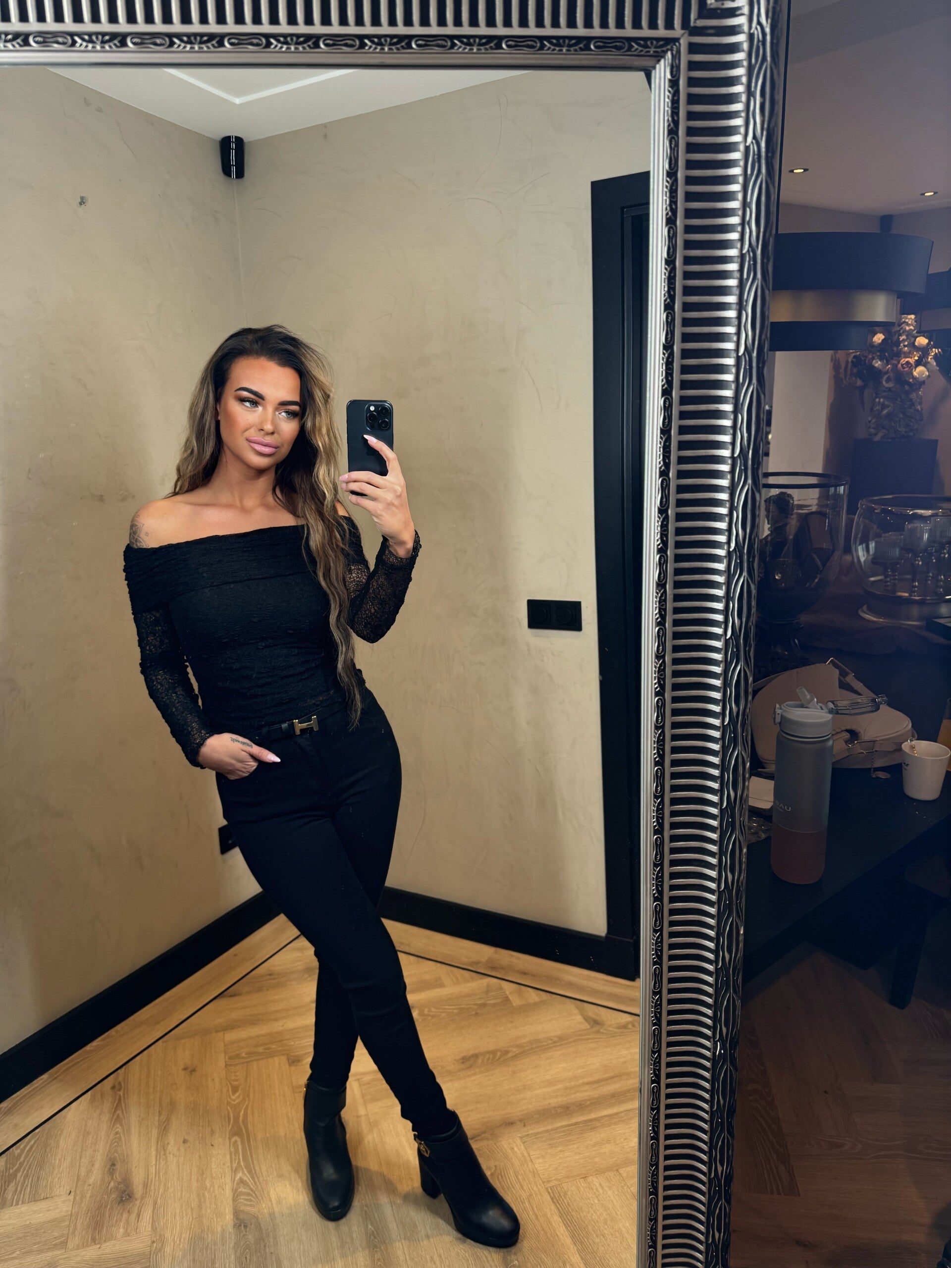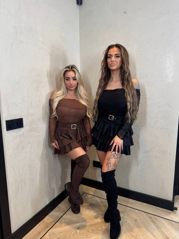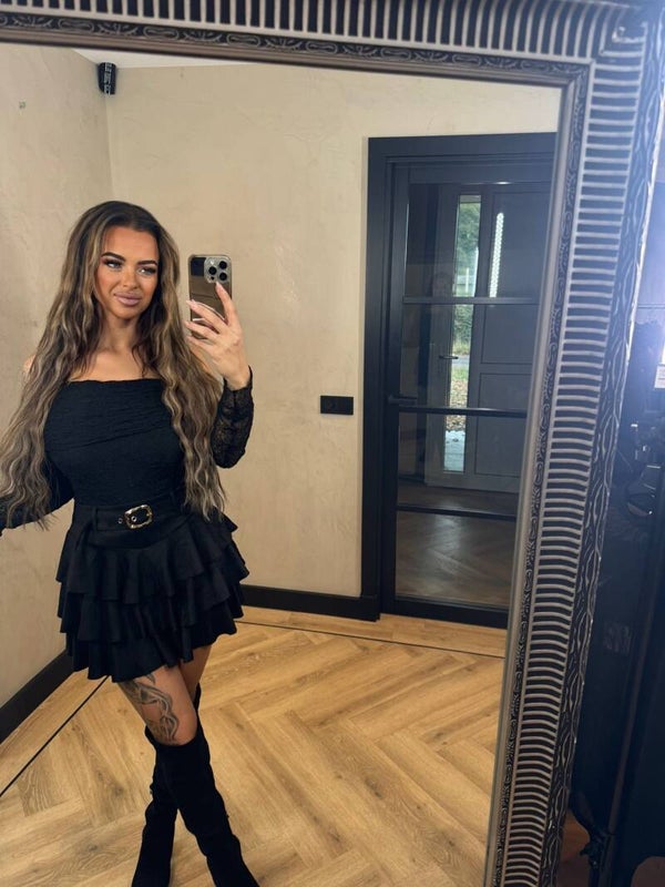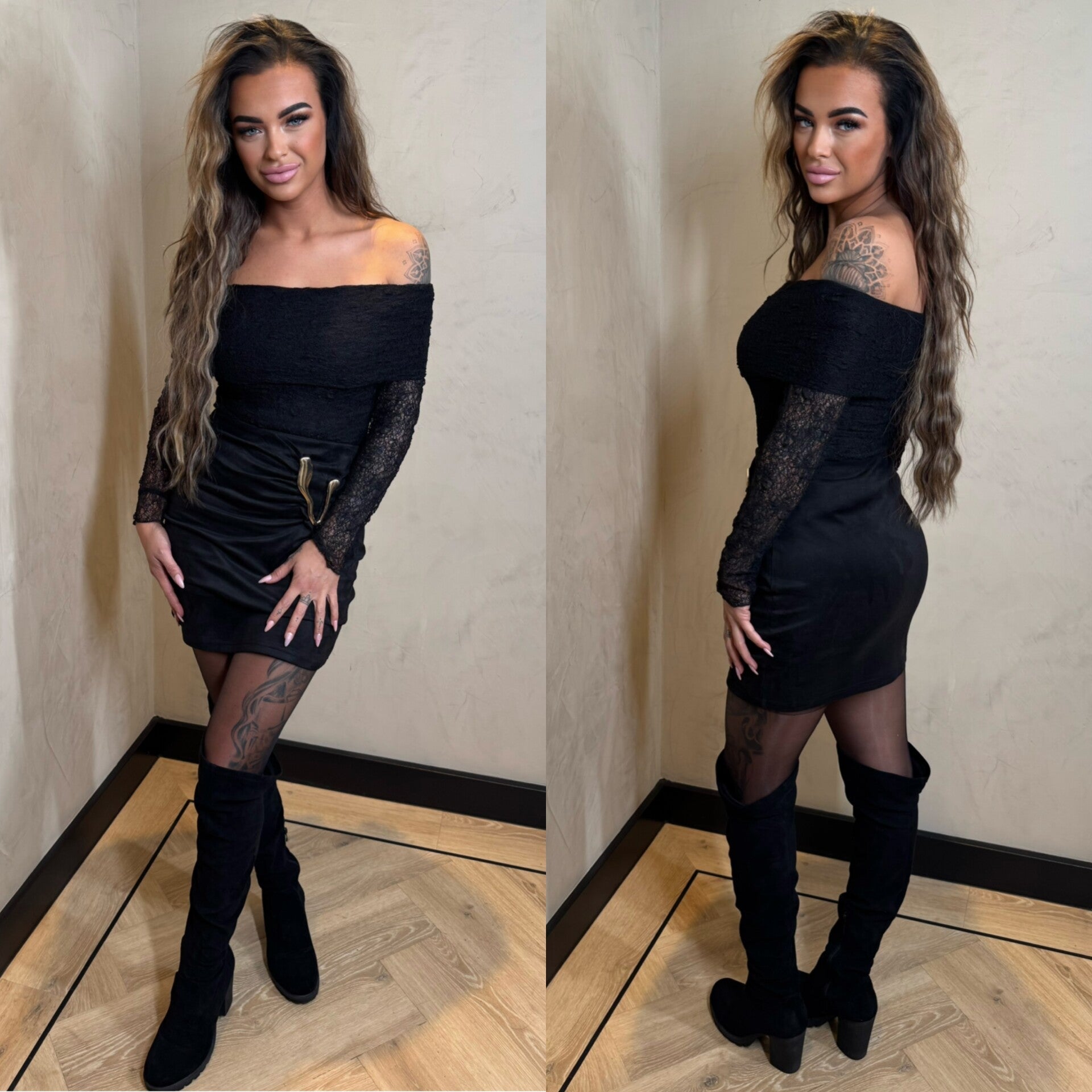 Gedetailleerd met een doorschijnend/kant stofje en de top is off-shoulder.